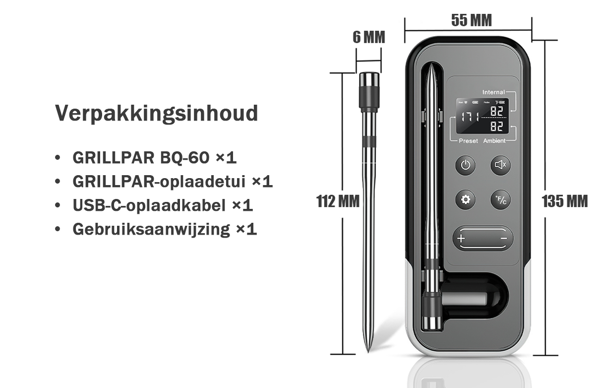 Grillpar BQ-60 – Draadloze Bluetooth-vleesthermometer voor steak, roken en grillen